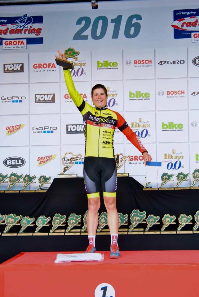 Dass sie nach 75 km und 2:22.14 Std. ganz vor lag und mit mehr als drei Minuten Vorsprung auf Anne Pons (2:25.24 Std.) und der Schweizerin Julia Wolff (2:28.42 Std.) die Ziellinie überqueren würde, war ihr lange nicht bewusst. „In der ersten Runde bin ich sehr gut die Hohe Acht hinaufgekommen, wusste aber nicht, ob noch eine Frau vor mir war“, so Burmeister. In der zweiten von drei Runden kündigte sie dann der Rennmoderator als führende Frau an. „Da wusste ich dann Bescheid“, meinte die Nutrixxion-Athletin, die kurze Zeit später Hilfe von Nutrixxion-Fahrer Alexander Friedrich erhielt. Der spannte sich vor Burmeister, gab ihr wichtigen Windschatten. „Das war echt nett und auch wirklich wichtig, denn im Finale habe ich heftige Magenschmerzen bekommen. Das war noch echt harte Arbeit. Aber es hat sich ja gelohnt“, freute sich Carmen Burmeister über ihren ersten großen Saisonerfolg für das Team Nutrixxion 4Fun.