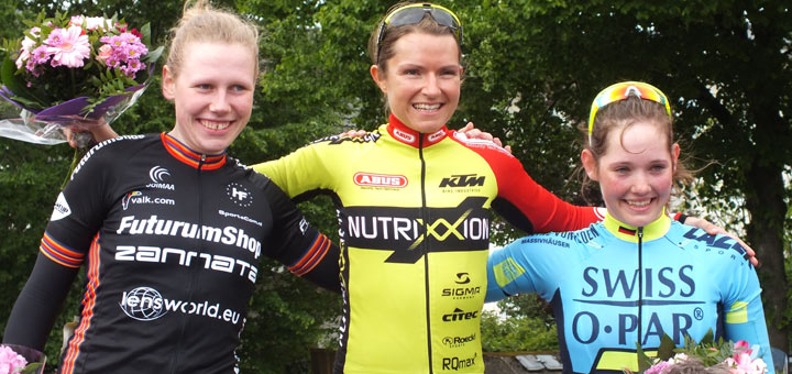 Am Ende schafften es gerade einmal vier Fahrerinnen, sich bei den stärksten Junioren zu behaupten: Mieke Kröger vom niederländischen Futurumshop-Team, ihres Zeichens Junioren-Weltmeisterin auf der Bahn und zig-fache deutsche Meisterin, Juniorinnen-Nationalfahrerin Wiebke Rodieck, Jessica Lambracht eben Melanie Heßling. Gemeinsam ging es dann auch in die letzte Runde. Da die Junioren gleichzeitig ihren Zieleinlauf hatten, wurde es schon am letzten Anstieg hektisch. „In einem langen Sprint von vorne erreichte ich dann die Ziellinie als erste vor Mieke Kröger und Wiebke Rodieck“, freute sich Melanie Heßling über ihren vierten Saisonsieg.