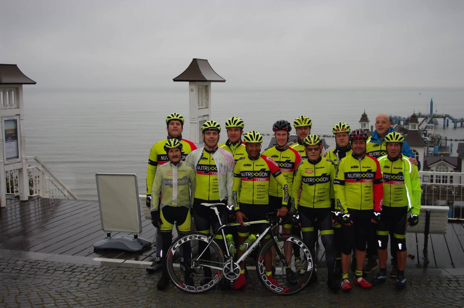Lutz Winker, der krankheitsbedingt auf einen Start verzichten musste, hatte sich zusammen mit Partnerin Petra ganz in den Dienst der Mannschaft gestellt und die Organisation übernommen. Teamessen am Vorabend, Mannschaftsfoto vor der Seebrücke in Sellin, Annahme von Trikots. Es passte alles zusammen. Wäre nur das Wetter etwas netter gewesen. Denn was die Teilnehmer am Start im Badeort Sellin erwartete, durfte getrost als Klassiker-Wetter umschrieben werden. 8 Grad und Dauerregen sorgten in Verbindung mit zahlreichen Kopfsteinpflaster-Passagen und kurzen, aber kräftigen Steigungen für echte belgische Atmosphäre. „Wer gedacht hat, Rügen sei flach, der lag wohl ziemlich daneben“, kommentierte Teamleiter Volker Heisters die Strecken über 54 bzw. 107 Kilometer.